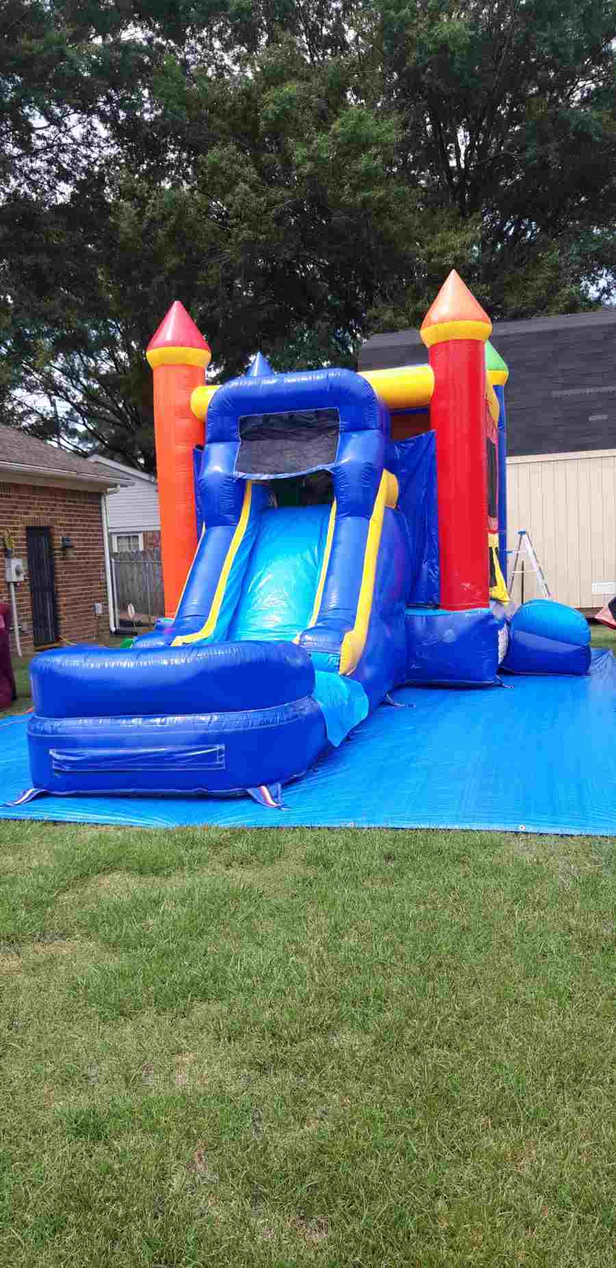 Castle combo unit features a single lane slide, a splash pool, hop, bumper and an attached bounce house. This popular model is the perfect choice for any kind of outdoor event or festival. The bounce house portion is styled like a fairytale castle, complete with inflatable turrets and a parapet roof line. The slide features an extra-wide lane, with high sides and a generously sized splash pool at its base. Can be use as wet splash, dry pool or pit balls which is a low additional price.