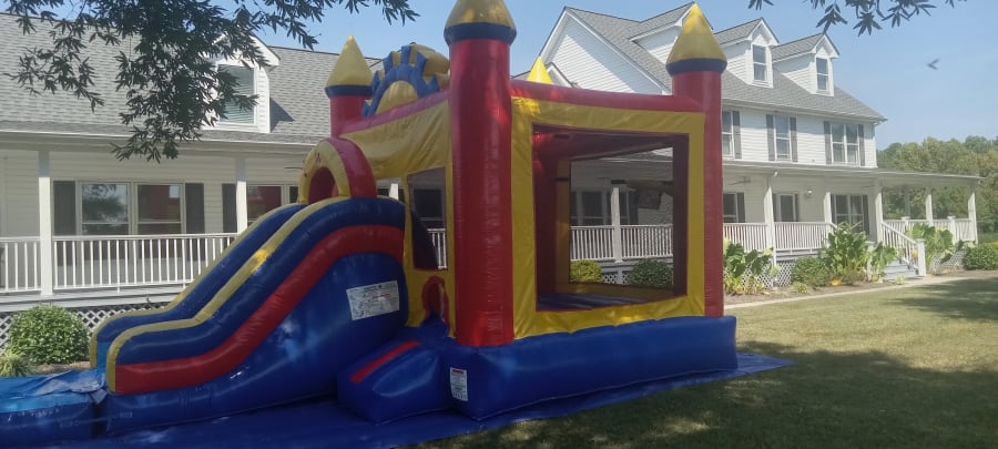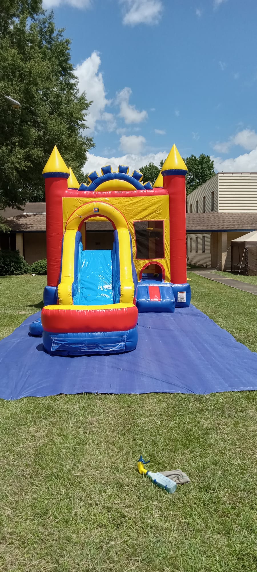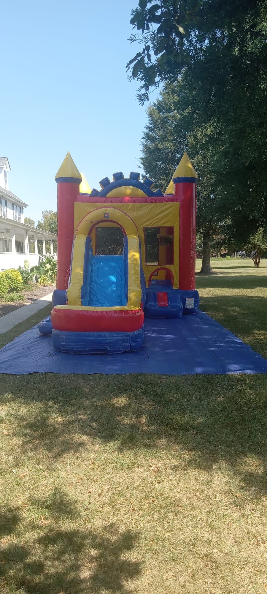 Unisex combo unit features a single lane slide, a splash pool, hop, and an attached bounce house. This popular model is the perfect choice for any kind of outdoor event or festival. The bounce house portion is styled like a fairytale castle, complete with inflatable turrets and a parapet roof line. The slide features an extra-wide lane, with high sides and a generously sized splash pool at its base. Can be use as wet splash, dry pool or pit balls which is a low additional price.